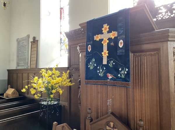 The pulpit fall and Bible ribbons are donated to St Colmon Church by the congregation in memory of James McLachlan 1933 – 2018, known to everyone as Jimmy, Session Clerk for 30 years. The images depicted on the fall reflect some of the joys of Jimmy’s life.